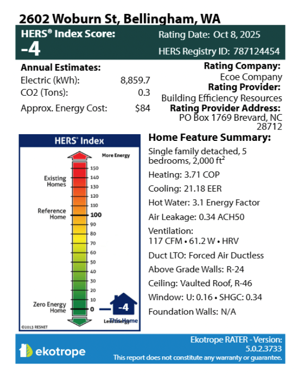 What does the HERS Score actually mean?  According to RESNET HERS INDEX, the lower the HERS score, the more efficient the home.  A HERS rating of 100 is equivalent to a standard home built to code.   A score of 50-60 is a build that performs above average. Every point under 100 is 1% more efficient.  A HERS 0 is a Zero Energy home, which means the home requires no additional power.  Essentially, it’s a home that produces enough electricity to offset what it uses and a HERS <0 is a Net-Positive energy home meaning that the home produces more power than it uses. Imagine charging your electric car AND still having a $0.00 power bill at the end of the month; this is a Net-Positive Home.