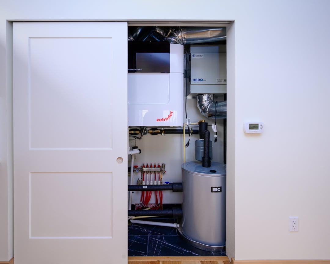 • Heating/Cooling: Chilltrix CX-34; hydronic radiant floor heating downstairs and 2 fan coil unit